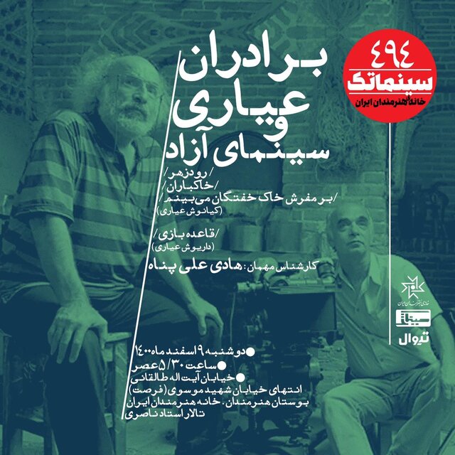 چهارصد و نود و چهارمین برنامه سینماتک خانه هنرمندان ایران به نمایش آثاری از کیانوش و داریوش عیاری اختصاص دارد.