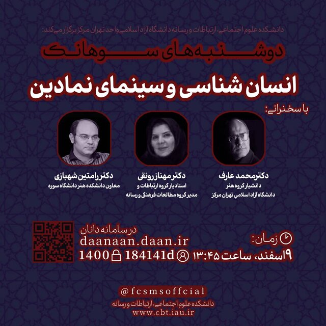 دانشگاه علوم اجتماعی، ارتباطات و رسانه دانشگاه آزاد اسلامی نشست تخصصی «انسان شناسی و سینمای نمادین» را با حضور جمعی از اسانید ارتباطات، فرهنگ و هنر برگزار می کند.